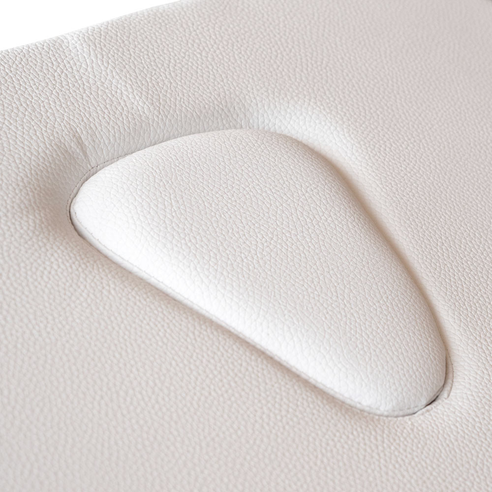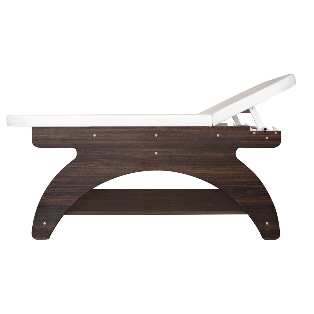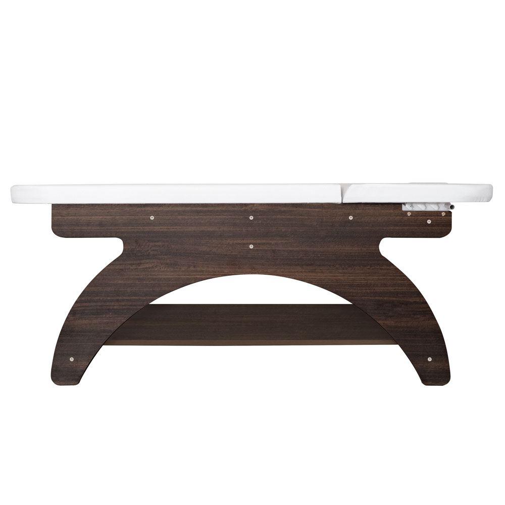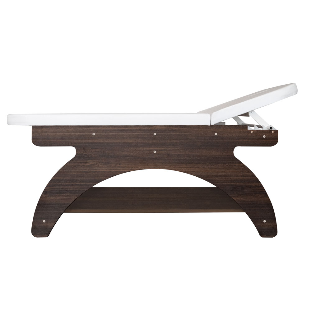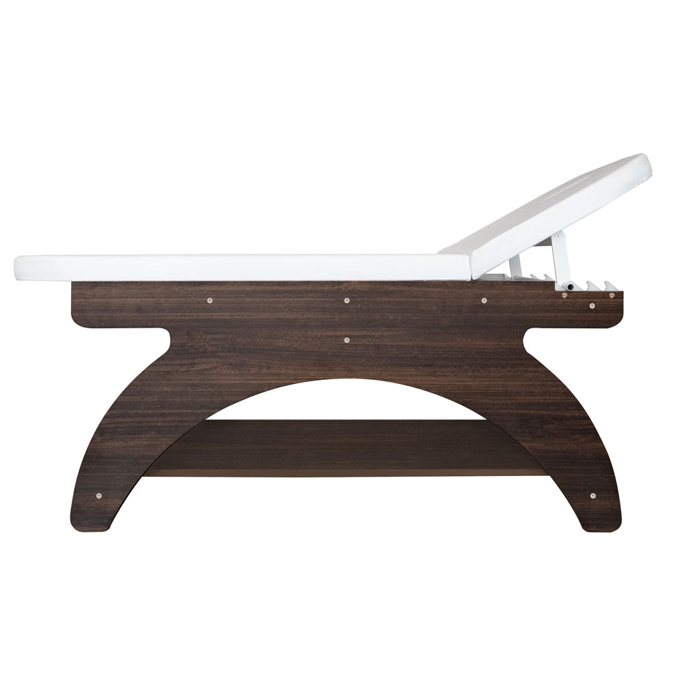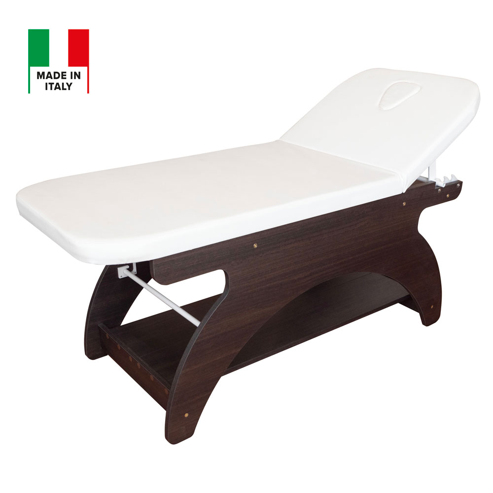 Elegante, in Italien gefertigte Massageliege aus wengefarbenem Melamin mit einem einzigen Gelenk. Hochdichte Matratze für maximalen Komfort, mit Gesichtsöffnung und passender Auflage. Die Kopfstütze ist manuell verstellbar. Die Liege verfügt außerdem über eine Rollenhalterung und eine große Ablagefläche für Zubehör. Nicht höhenverstellbar.